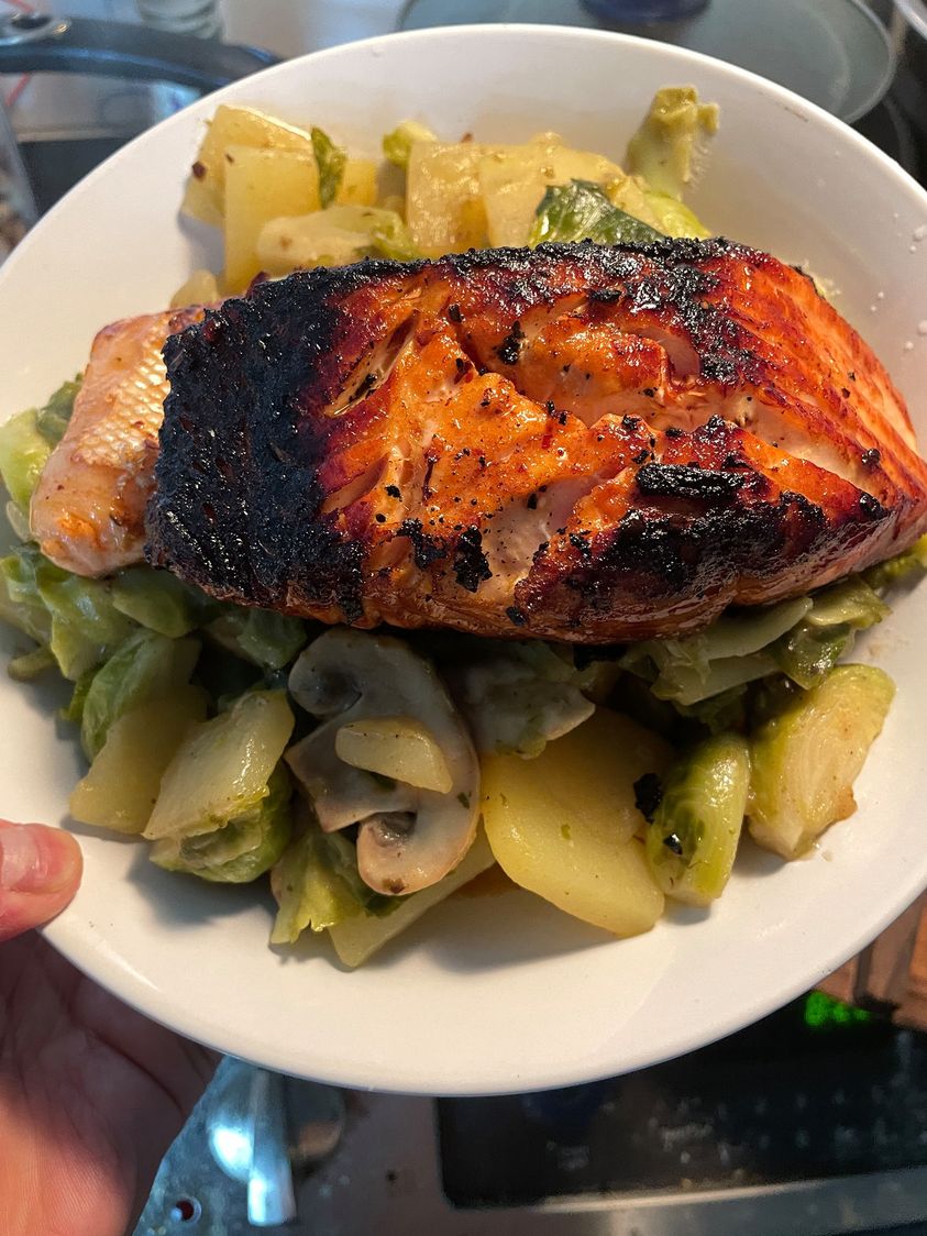 - Cook salmon to preference. I like to searfor 3 min on each side, flip one more time and sear for 1 min. This will cook the fish through but leave it very tender.